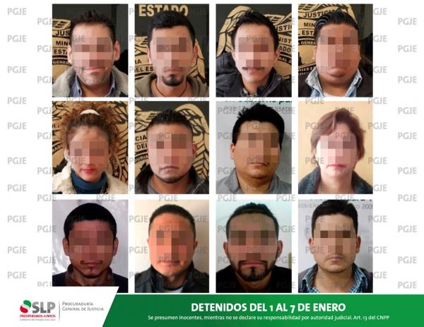 La Procuraduría General de Justicia de San Luis Potosí (PGJSLP) informó que en la primera semana de este 2018, fueron detenidas en casos distintos, 12 personas por haber entrado en conflicto con la ley por delitos como tentativa de feminicidio, homicidio calificado, portación de arma de fuego, abigeato agravado, robo calificado y sustracción de menores.
