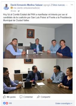 Después de haber sostenido una reunión privada en Palacio de Gobierno de San Luis Capital, con el Secretario General de Gobierno Alejandro Leal Tovías, para acordar que el candidato a la alcaldía de Ciudad Valles por la alianza PRI, Partido Verde, PANAL y Conciencia Popular sería el empresario David Medina Salazar, reculó de dicha designación para alinearse en las filas del Partido Acción Nacional, una hora después de haber estado con el Gobernador Juan Manuel Carreras López.