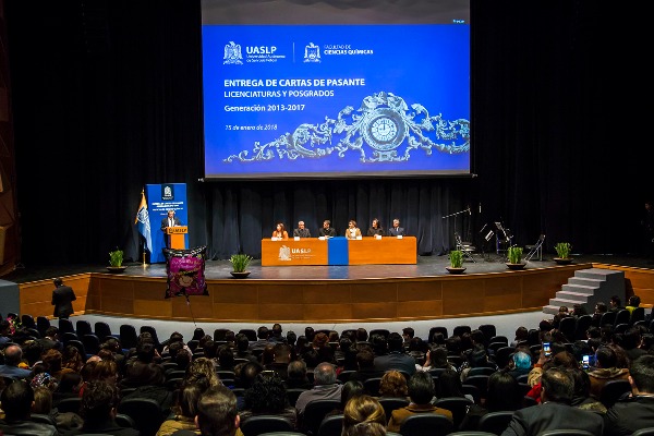 La Universidad Autónoma de San Luis Potosí, realizó la entrega de cartas de pasante de las cinco licenciaturas y cuatro posgrados de la Facultad de Ciencias Químicas de la Uaslp a la generación 2013-2017 compuesta por 100 jóvenes de licenciatura y 35 egresados de posgrado.