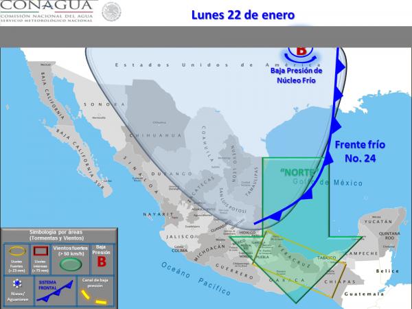 Los efectos mencionados serán ocasionados por el rápido desplazamiento del Frente Frío Número 24 en el noreste, el litoral del Golfo de México y el sureste del país.