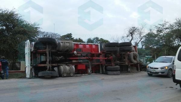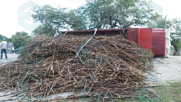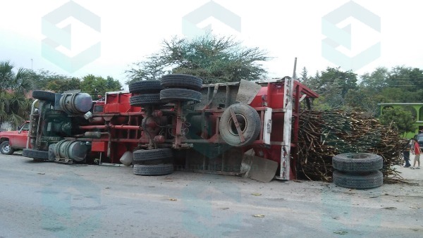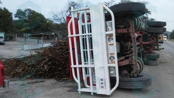 Un camión que transportaba caña se volcó en el kilómetro 7 de la carretera federal número 70, a la entrada al ejido San Felipe.