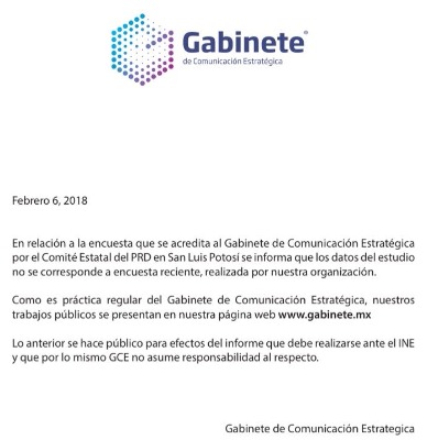 "Con respecto a la encuesta que el Comité Estatal del #PRD en San Luis Potosí acredita a GCE, informamos que los datos del estudio no corresponden con ninguna encuesta reciente realizada por nosotros. Todos los estudios públicos pueden ser consultados en http://www.gabinete.mx", refiera la casa encuestadora en su cuenta en Twitter.