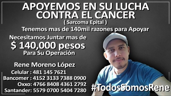 René Moreno requiere los 140 mil pesos para su operación en marzo, para continuar su tratamiento con radioterapias. Las personas pueden hacer su donativo por la cantidad que esté a su alcance al número 4766-8408-4351-2792 en las tiendas Oxxo. Para mayor información acerca de como pueden colaborar con esta noble causa pueden contactar al teléfono celular 481-145-76-21.