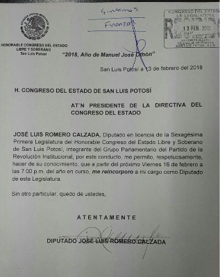 En la carta el diputado José Luis Romero Calzada no detalla los motivos para regresar a sus funciones a partir de la fecha ya mencionada.