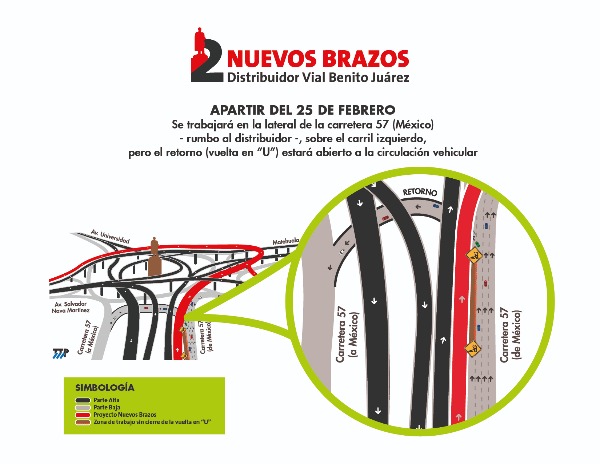 Como parte de los trabajos que se desarrollan en la zona de construcción de los dos nuevos brazos al Distribuidor Vial Benito Juárez, el Gobierno del Estado a través de la Junta Estatal de Caminos informó que a partir del próximo lunes 25 de febrero se iniciarán trabajos sobre una lateral de la carretera 57, en el carril de retorno.