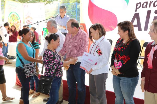 Enseguida, Lorena Valle Rodríguez, encabezó la entrega de apoyos del Proyecto Estratégico de Seguridad Alimentaria (PESA), mediante el cual gracias al trabajo conjunto con la Secretaría de Desarrollo Agropecuario y Recursos Hidráulicos (Sedarh) y la Delegación de la Secretaría de Agricultura, Ganadería, Pesca y Alimentación (Sagarpa), ha sido posible que pequeños productores y productoras, fortalezcan su economía al vender sus excedentes de hortalizas y huevos a los espacios alimentarios.