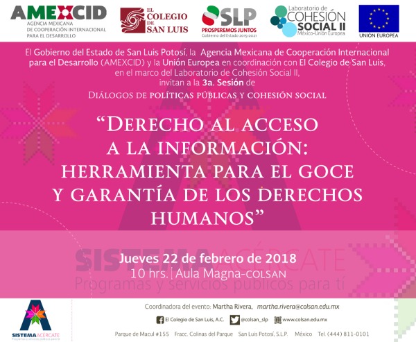En el marco de colaboración entre El Colegio de San Luis A. C., y la Secretaría de Relaciones Exteriores, a través de la Agencia Mexicana de Cooperación Internacional para el Desarrollo (AMEXCID) y con el objetivo de brindar un espacio de encuentro y debate entre instituciones, academia y sociedad civil, alrededor del derecho a la información pública gubernamental, políticas públicas y cohesión social, tendrá lugar el tercer evento del ciclo Diálogos de Políticas Públicas y Cohesión Social este 22 de febrero del año en curso, a partir de las 10:00 horas en el Aula Magna del El Colegio de San Luis A. C.