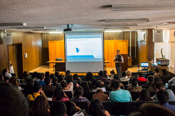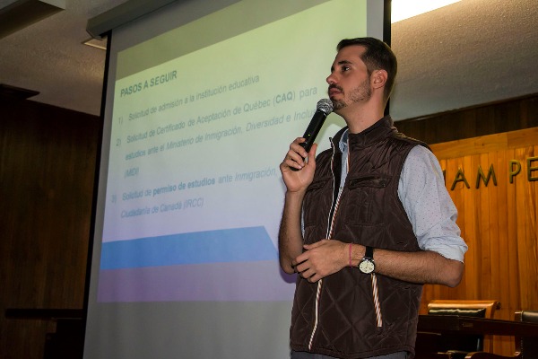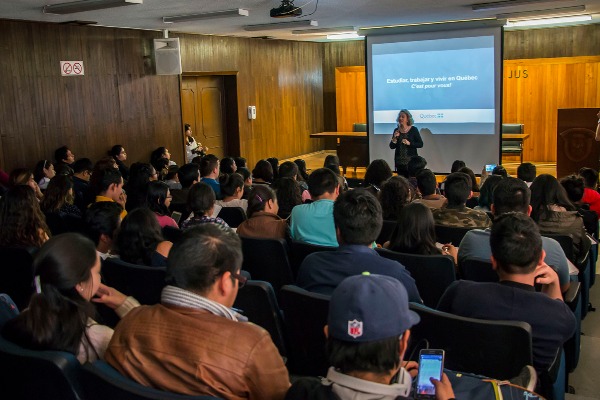 Ante un auditorio lleno en el Aula Magna Félix Fernández de la Facultad de Derecho de la UASLP, Pablo Enrique Ayuso asesor de inmigración de la Delegación General de Québec en México, invitó a los estudiantes Universitarios a realizar un intercambio a esta provincia de Canadá.