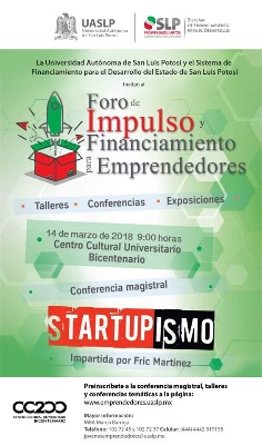 El Departamento de Desarrollo Emprendedor de la UASLP en conjunto con el Sistema de Financiamiento para el Desarrollo del Estado (SIFIDE), invitan a todos los jóvenes que deseen iniciar un negocio al Foro de Impulso y Financiamiento para Emprendedores, a realizarse este 14 de marzo en punto de las 9:00 de la mañana en el Centro Cultural Universitario Bicentenario.