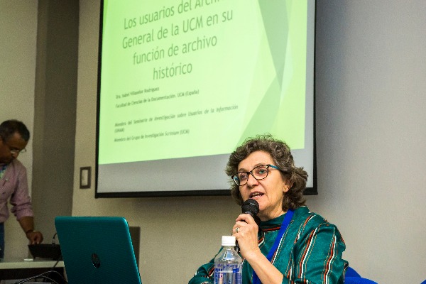 La Dra. Villaseñor Rodríguez mencionó que colabora con el Seminario de Investigación sobre Usuarios de la Información, antecedente del Congreso Internacional, desde el año 2008, "me enfoco a la investigación, y en este caso trabajamos con usuarios de archivos, por tal motivo la ponencia está relacionada con el archivo de la Universidad Complutense de Madrid, en su función de archivo histórico.