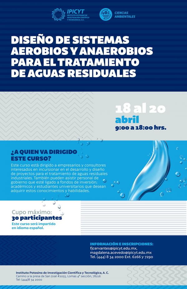 El crecimiento industrial ha originado también una creciente contaminación de los cuerpos de agua naturales, por lo que las empresas que descargan aguas residuales deben tratar sus descargas de manera eficiente y oportuna; esta es una de las principales razones por las que el Instituto Potosino de Investigación Científica y Tecnológica (IPICYT), organiza un curso para diseño de sistemas de tratamiento de aguas residuales denominado: "Diseño de Sistemas Aerobios y Anaerobios para el Tratamiento de Aguas Residuales", a realizarse del 18 al 20 de abril próximos.