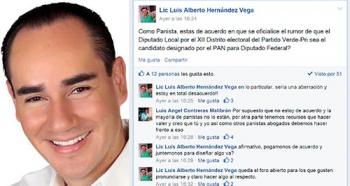 El militante y ex aspirante a la Diputación Local por el XII Distrito Luis Alberto Hernández Vega generó el debate a través de la página de facebook “Panista de Corazón” en donde expone su rechazo a la “propuesta” que hizo el aspirante a la Alcaldía de Valles Francisco José Gómez Faisal con el respaldo del Comité Directivo Estatal que encabeza Mendizábal Pérez.