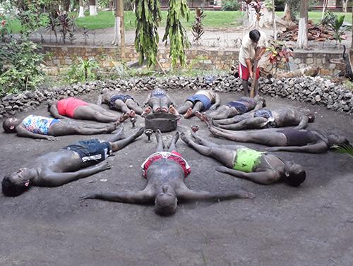 La entrada al vientre de la madre se indica después de un lavatorio con barro negro, y la purificación con el humo del incienso producido por el copal, trasluciendo las caras camuflajeadas con el entorno obscuro de la noche, se toma el tiempo para quitar el estrés, del que se viene cargado del fastidio y bullicio de la mancha urbana, para conectarse, con la madre Tierra, con el universo, con nuestros más profundos orígenes espirituales, de los que la ciencia no ha podido demostrar que existe, y que sin embargo, saben que está ahí.
