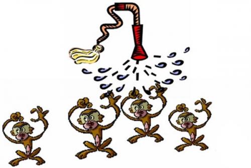 Hambriento, uno de los monos empezó a subir por el palo para conseguir algo para comer, pero cuando estaba por alcanzar las bananas, se le lanzó un chorro de agua fría. Chillando, se bajó del palo y renunció a su intento de conseguir comida.