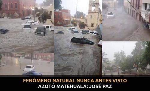 “El jueves por la noche empezó uno de los fenómenos naturales nunca antes visto en la ciudad, una tromba torrencial que se suscitó causando grandes daños materiales y generando un pánico generalizado entre los ciudadanos, que no podíamos creer lo que estaba sucediendo, vehículos arrastrados por el agua, motocicletas entre la corriente y un sinfín de objetos navegando por las calles de la ciudad”, narra el comunicador de la estación radiofónica Oye 105 FM de Matehuala, José Paz Villanueva.