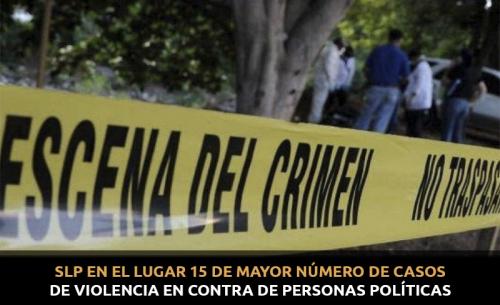 De acuerdo al Tercer Informe de Violencia Política en México 2021 de Etellekt Consultores, la entidad potosina se ubica en el lugar número 15 con mayor número de casos de violencia en contra de personas políticas.