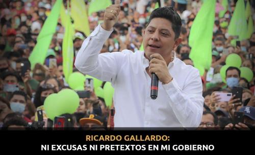 Ricardo Gallardo tiene claro que cumplirá los compromisos contraídos con los potosinos, porque "a nosotros nos inventan de todo, pero nunca nos han inventado que hemos faltado a la palabra, porque no sucede ni sucederá nunca en la vida, somos personas de una sola pieza, la palabra es lo principal que debe de tener el hombre, el día que el hombre pierde la palabra, ese día pierde la hombría en su totalidad y ustedes lo saben, yo siempre he sido a la antigüita, de rancho y siempre hemos creído que la palabra es lo que hace valer al hombre y hoy la palabra que empeñamos debe ser primordial y lo van a ver".