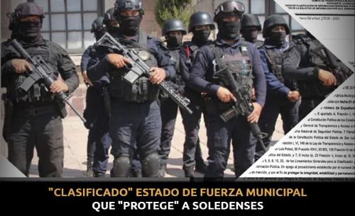 El Ayuntamiento de Soledad de Graciano Sánchez, encabezado por Leonor Noyola, mantiene como "Clasificada la Información" referente al número de policías municipales con los que cuenta la Dirección General de Seguridad Pública Municipal (DGSPM), al igual que de cuántos hombres y de cuántas mujeres se compone.
