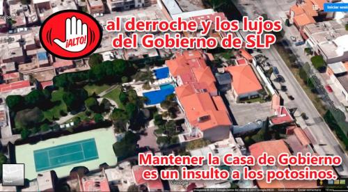 - Se propone al Congreso del Estado autorizar la desincorporación para objeto de venta de la onerosa, ostentosa y lujosa Casa de Gobierno, ubicada en Montañas Rocallosas Número 122 Fraccionamiento Las Cumbres de San Luis Capital. Eso era lo primero que todos estábamos esperando, que si el gobierno está hablando de austeridad, era lo primero que esperábamos, que se deshiciera de ella, porque nada más en mantenimiento y gastos indirectos se llevan 8 millones de pesos, es decir, en el tiempo de Fernando Toranzo mantenerle la casita para fiestas, reuniones y pachangas nos costó más de 20 millones de pesos. Esos 8 millones de pesos anuales, deberían destinarse a acciones de beneficio colectivo además de la recuperación del costo del inmueble.