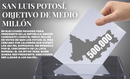 Ninguno de los tres logró el medio millón de votos en San Luis Potosí, el más cercano fue Calderón que superó los 460 mil sufragios, sin embargo por el crecimiento de la lista nominal el objetivo para quien quiera ser presidente, bien podría ser llegar a los 500 mil.