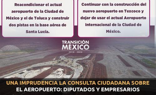 Diputados y representantes de la Iniciativa Privada en San Luis Potosí rechazaron la consulta ciudadana que el presidente electo Andrés Manuel López Obrador ha anunciado respecto a la construcción del Nuevo Aeropuerto Internacional de México.