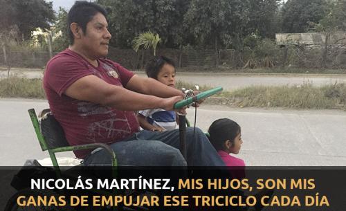 Tras la tragedia, Nicolás tuvo que sacar a su hija de la escuela en la mañana, ahora está en la tarde, así él puede pasar por ambos niños en su triclico adaptado. Este vehículo hechizo es el medio de transporte, pero le debe invertir mucho esfuerzo especialmente en las subidas, se ha acostumbrado, pero menciona que las prótesis le están lastimando sus rodillas y como apoyo de salud cuenta sólo con Seguro Popular “Una vez me andaba volteando se me doblo el pie, pero alcancé a agarrar mi triciclo”, comenta.