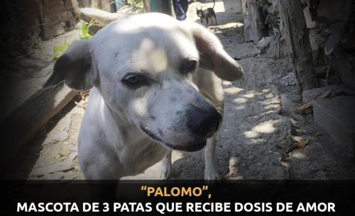 “Palomo” es un perrito de dos años que nació con un problema congénito, sólo tiene 3 patas, cuando era muy pequeño y antes de aprender a caminar rodaba por el terreno de la casa, en donde le dan el mejor alimento, dosis de amor.
