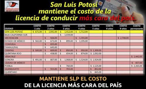 El costo por tres años en San Luis Potosí es de 1 mil 412 pesos mientras en estados como Durango es de 710 pesos y en Nuevo León de 676 pesos.
