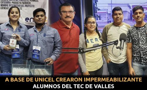 Alumnos del Instituto Tecnológico de Ciudad Valles desarrollaron un proyecto para la elaboración de un impermeabilizante a base de unicel, que ayuda a la protección de las losas y genera una disminución en la temperatura interior de la vivienda, además de que contribuye a evitar la contaminación del medio ambiente con ese material de mucho uso en la vida cotidiana.