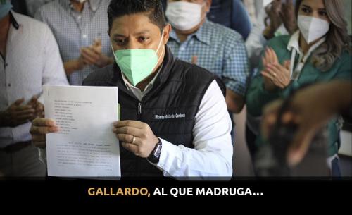 Tal parece que el desarrollo del proceso en los diversos partidos genera condiciones favorables para Gallardo Cardona quien, a diferencia de hace seis años, ahora ya tiene un pre registro de cara a la Gubernatura del Estado, y aunque si bien, "al que madruga dios le ayuda", hay otro dicho que dice "no por mucho madrugar, amanece más temprano"; ante ambas circunstancias, lo mejor para el político soledense será tomar las cosas con calma y que el tiempo defina su rumbo.