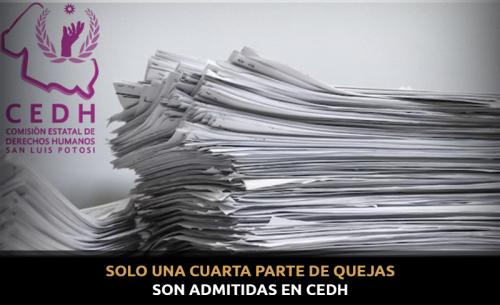 Con las 4 mil 527 inconformidades, la entidad potosina se colocó el sexto estado del país con más quejas detrás de Nuevo León, Veracruz, Puebla, la Ciudad de México y el Estado de México, aunque como se dio cuenta solo una cuarta parte ingresó a los escritorios de la CEDH.