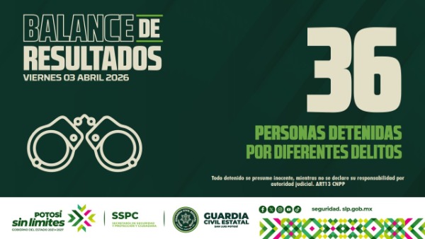 Derivado de labores de vigilancia, prevención del delito y trabajos de inteligencia, la Guardia Civil Estatal (GCE) detuvo en las últimas 24 horas a 36 personas, presuntamente vinculadas con diversas conductas que afectan la paz y el orden en San Luis Potosí.
