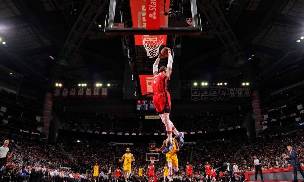 Ambos equipos sufrieron al momento de anotar por momentos en la primera mitad, pero al final del segundo periodo Harden acertó un triple de larga distancia y recibió una falta. El tiro encendió a Harden y a la afición del Toyota Center, incluido el rapero Travis Scott, quien estaba sentado en primera fila.