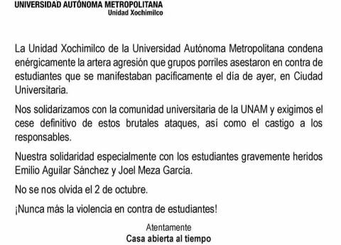 "La Unidad Xochimilco de la Universidad Autónoma Metropolitana condena enérgicamente la artera agresión que grupos porriles asestaron en contra de estudiantes que se manifestaban pacíficamente el día de ayer (3 de septiembre), en Ciudad Universitaria", dio a conocer mediante un comunicado la UAM Xochimilco.