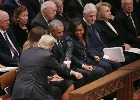 El presidente de Estados Unidos, Donald Trump, y su antecesor, Barack Obama (presidente estadounidense en el periodo 2009-2017), se dieron hoy la mano al comienzo del funeral del exmandatario estadounidense George H. W. Bush (1989-1993), pero no hubo ninguna interacción entre el jefe de Estado y su rival en las elecciones de 2016, Hillary Clinton.