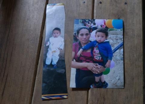 Nos recibe en su casa. Saca un archivero de plástico azul en donde guarda dos recortes de fotografías de su hijo. En una de las imágenes el niño está vestido de blanco para su presentación en la Iglesia y en otra aparece con su madre, que lo está cargando.