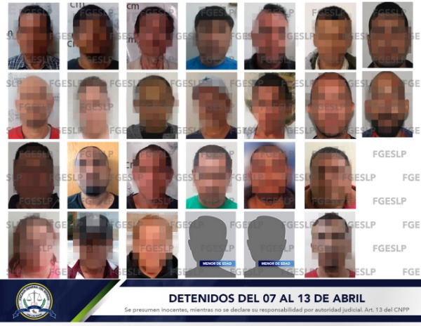 Durante la segunda semana del mes de abril, la Fiscalía General del Estado de San Luis Potosí (FGESLP), a través de la Policía de Investigación (PDI), logró la detención de 26 personas por diferentes delitos, de los cuales 13 fueron en flagrancia y el resto por órdenes de aprehensión.