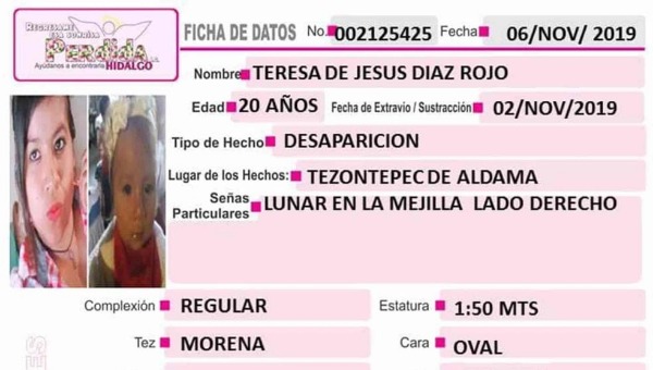 El pasado 2 de noviembre Teresa de Jesús Díaz Rojo, de 20 años, desapareció en Tezontepec de Aldama según la ficha de datos que emitió Sonrisas Perdidas Hidalgo, con ella se encontraba su hija Estrella Guadalupe Pérez Díaz, de 6 meses.