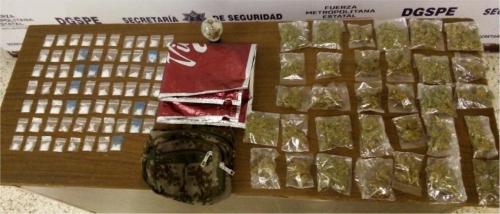 Como resultado de las acciones de vigilancia que realiza la Secretaría de Seguridad Pública del Estado, a través de la Fuerza Metropolitana Estatal, detuvieron a dos hombres por el presunto delito de posesión de droga, ya que se les encontraron 100 dosis de diversas sustancias.