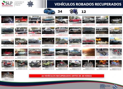 Las unidades localizadas corresponden a 19 automóviles particulares tipo sedán, 11 camionetas tipo pick up y cuatro tipo van, así como 12 motocicletas, de la misma manera, por el delito de robo de vehículo fueron detenidas cinco personas y por robo de motocicleta tres individuos.