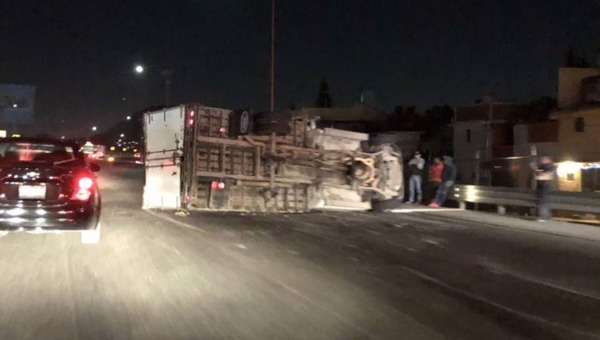 Informaron la volcadura de un camión tortón cargado de vísceras de res, en el kilómetro 18+500 rumbo a México.