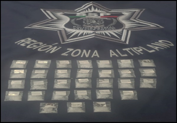 Por último, derivado de las acciones de vigilancia, realizadas en el marco del operativo "Matehuala Seguro", en Boulevard Turístico, de la colonia Providencia, en el municipio de Matehuala, agentes Estatales aseguraron 30 dosis de la droga sintética conocida como cristal.