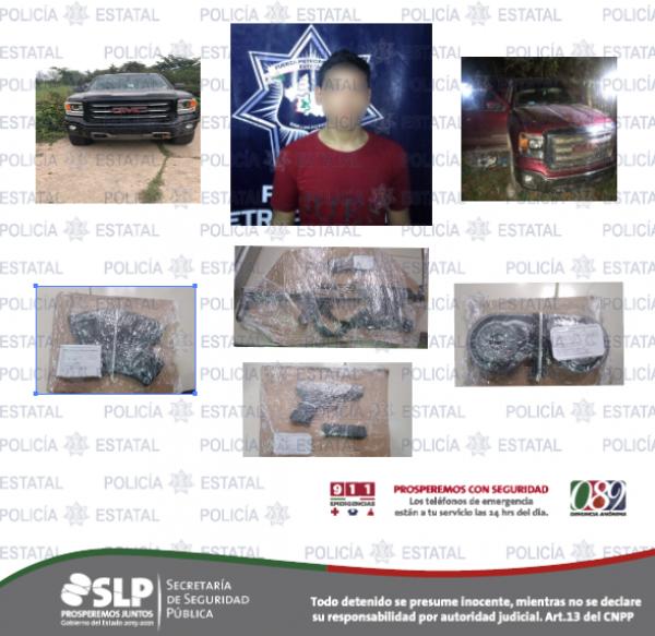 Posterior a la detención del presunto, en un predio rústico en el Barrio Los Pericos, de Tamuín, fue localizada un segundo vehículo implicado en el caso, mismo que presentaba blindaje artesanal, siendo una camioneta GMC, doble cabina, 2017, color rojo. Además, al interior fueron localizados parches con siglas de un grupo delictivo, residuos de cristal y marihuana, un cartucho útil y artefactos metálicos conocidos como poncha llantas.