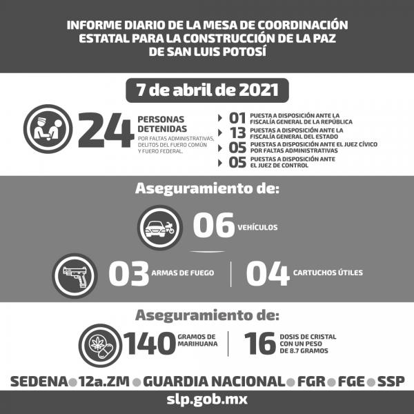 A través de operativos realizados en conjunto en las cuatro regiones de San Luis Potosí, la Mesa Estatal para la Construcción de la Paz informa que 24 personas detenidas fueron puestas a disposición de las autoridades correspondientes, por diversos delitos y faltas.