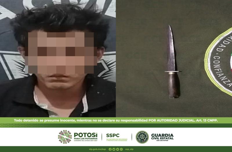 Agentes de la Guardia Civil Estatal, realizaron el aseguramiento de un hombre acusado de amenazas en el municipio de Ciudad Valles, asegurándosele un cuchillo de 25 centímetros de longitud.