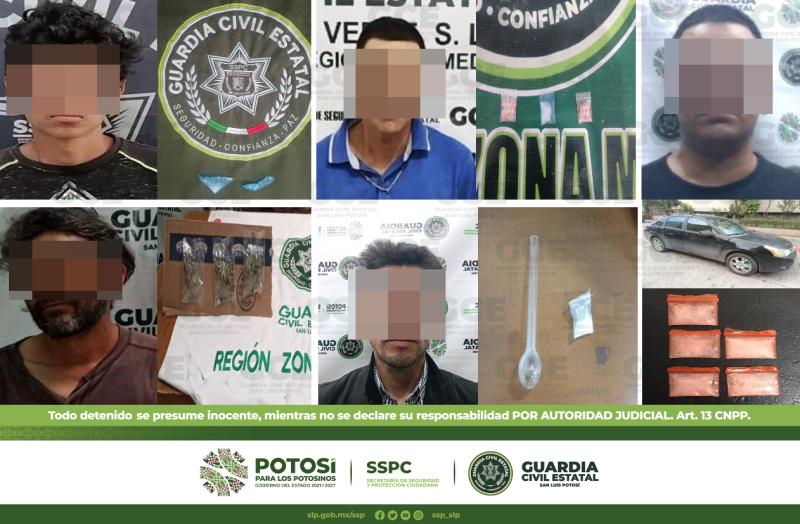 En las diferentes colonias de la zona metropolitana, agentes estatales aprehendieron a 9 personas: la primera de ellas se ubicó en la colonia Lomas de San Luis, se trata de Adolfo de 32 años de edad, a quien se le aseguraron cuatro dosis de "cristal"; en la colonia Las Piedras, a Luis de 26 años se le aseguró una dosis de marihuana; durante los recorridos en la colonia Morales, a David de 19 años se le aseguraron tres dosis de cocaína; a su vez, en el Barrio de Santiago, a Víctor de 39 años se le aseguró una dosis de "cristal".