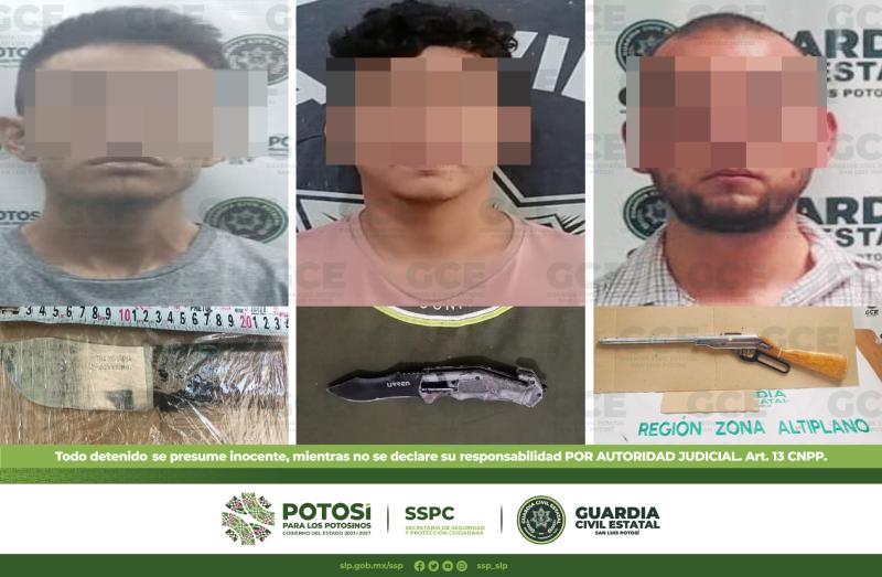 • Mediante los operativos de seguridad y vigilancia que se implementan en todo el territorio potosino para inhibir actos que puedan ser constitutivos del delito, tres hombres fueron detenidos por elementos de Guardia Civil Estatal (GCE) después de que se les aseguraran armas punzocortantes.