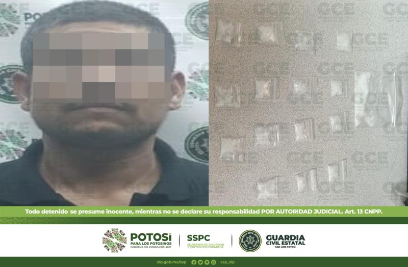 • En continuidad a los operativos de reacción inmediata emitidos por agentes de la Guardia Civil Estatal (GCE) en el sector oriente de la capital potosina, oficiales de las fuerzas del orden detuvieron a un presunto vendedor de droga con 16 dosis de "cristal".