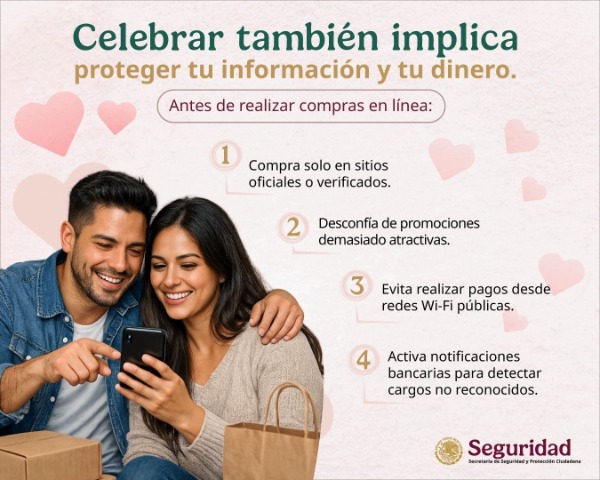 • La Secretaría de Seguridad y Protección Ciudadana (SSPC), a través de la Unidad de Inteligencia, Investigación Cibernética y Operaciones Tecnológicas, emite recomendaciones de autocuidado digital para compartir y recibir información, así como para realizar compras seguras durante la celebración del Día del Amor y la Amistad.