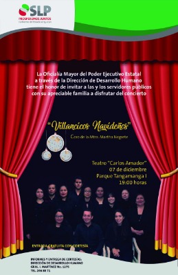 La Oficialía Mayor de Gobierno del Estado a través de la Dirección de Desarrollo Humano, invitan a todas y todos los servidores públicos que acudan acompañados de sus familias y disfruten de este concierto de "Villancicos Navideños" en punto de las 19:00 horas, en el Teatro "Carlos Amador", ubicado al interior del Parque Tangamanga I.